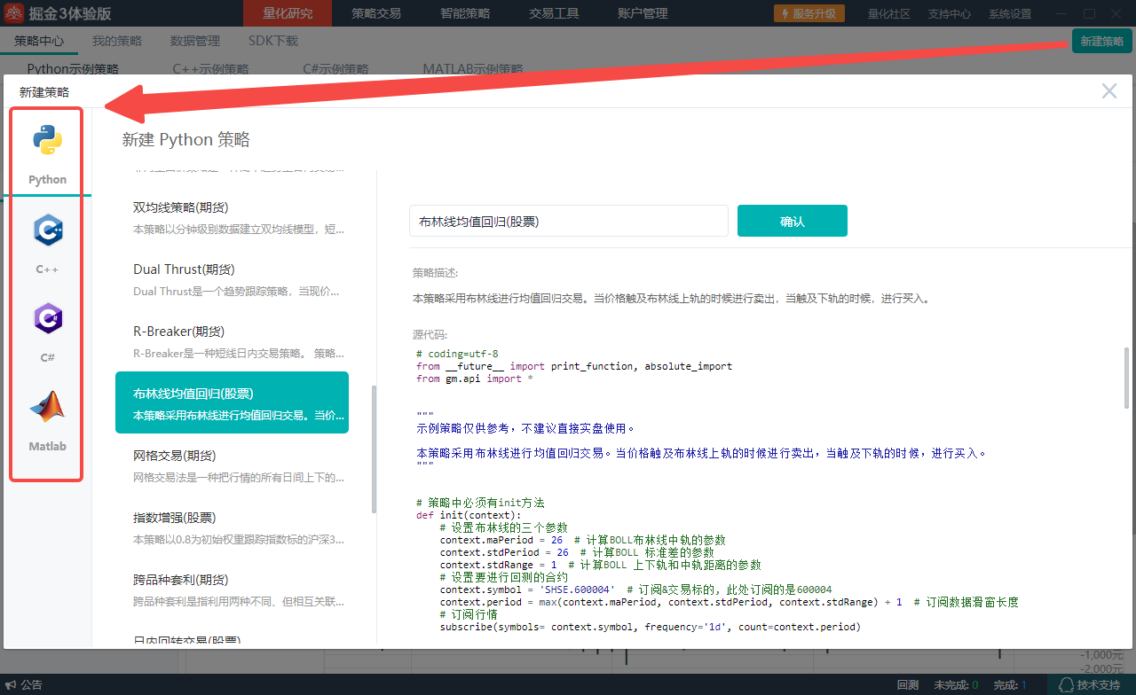 您可在终端的“量化研究”板块点击页面右上角的“新建策略”,然后点击弹出页面中最左侧的编程列表选择相应的编程语言进行策略新建。