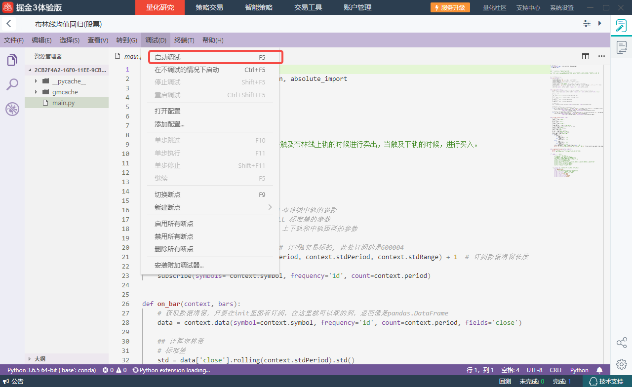 掘金量化终端的内置 IDE 仅支持 Python 语言,其他语言请使用第三方 IDE 编辑。