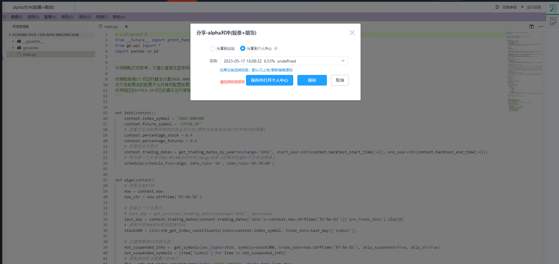 该功能可以将您的策略、回测报告分享至掘金社区或个人中心。