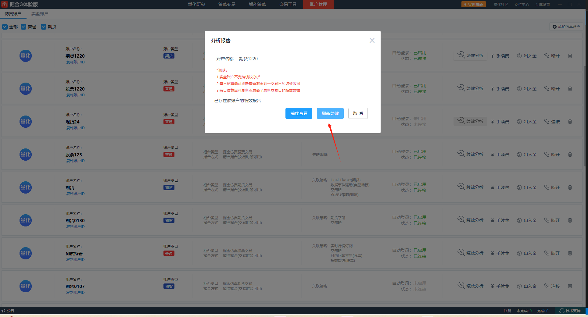 然后点击 “刷新绩效”,查看仿真账户最新绩效。