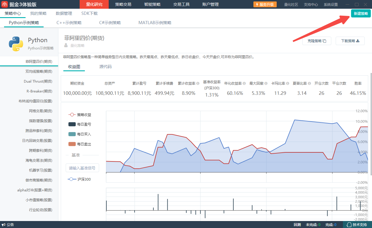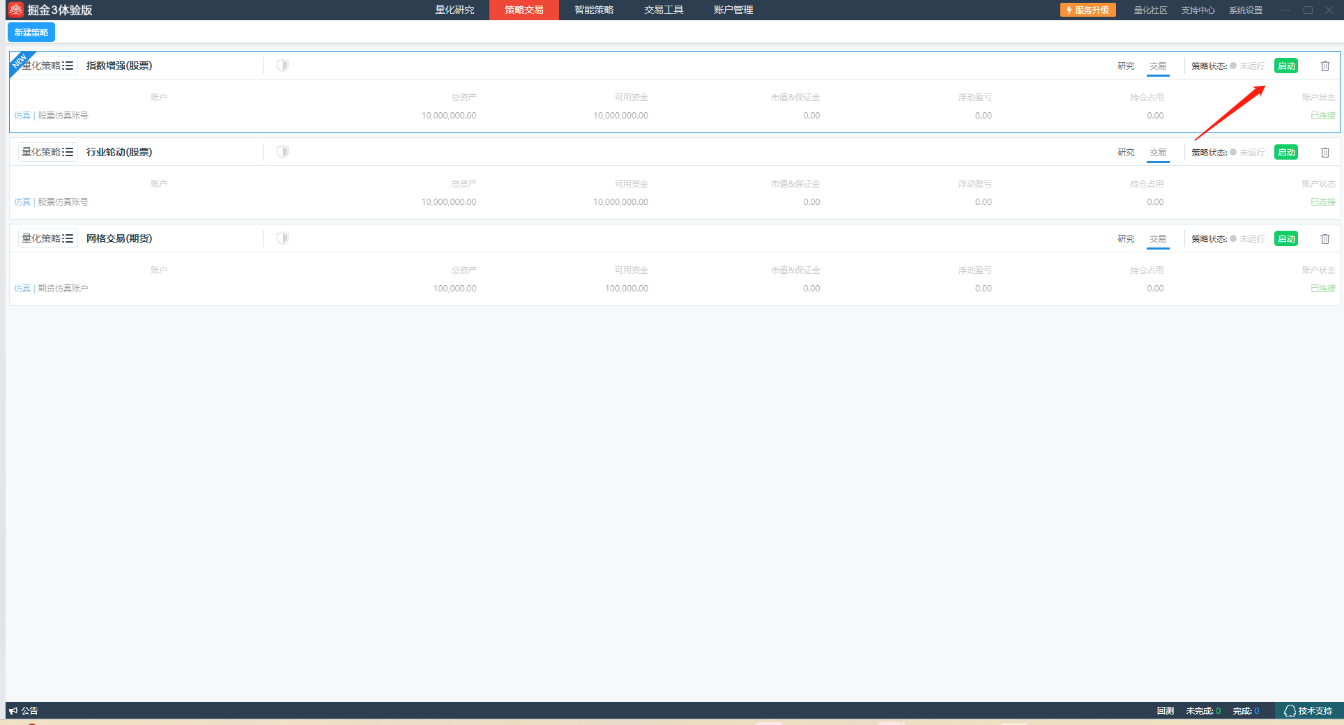 1、打开掘金量化终端,在“量化研究”的板块下点击右上角的“新建策略”。