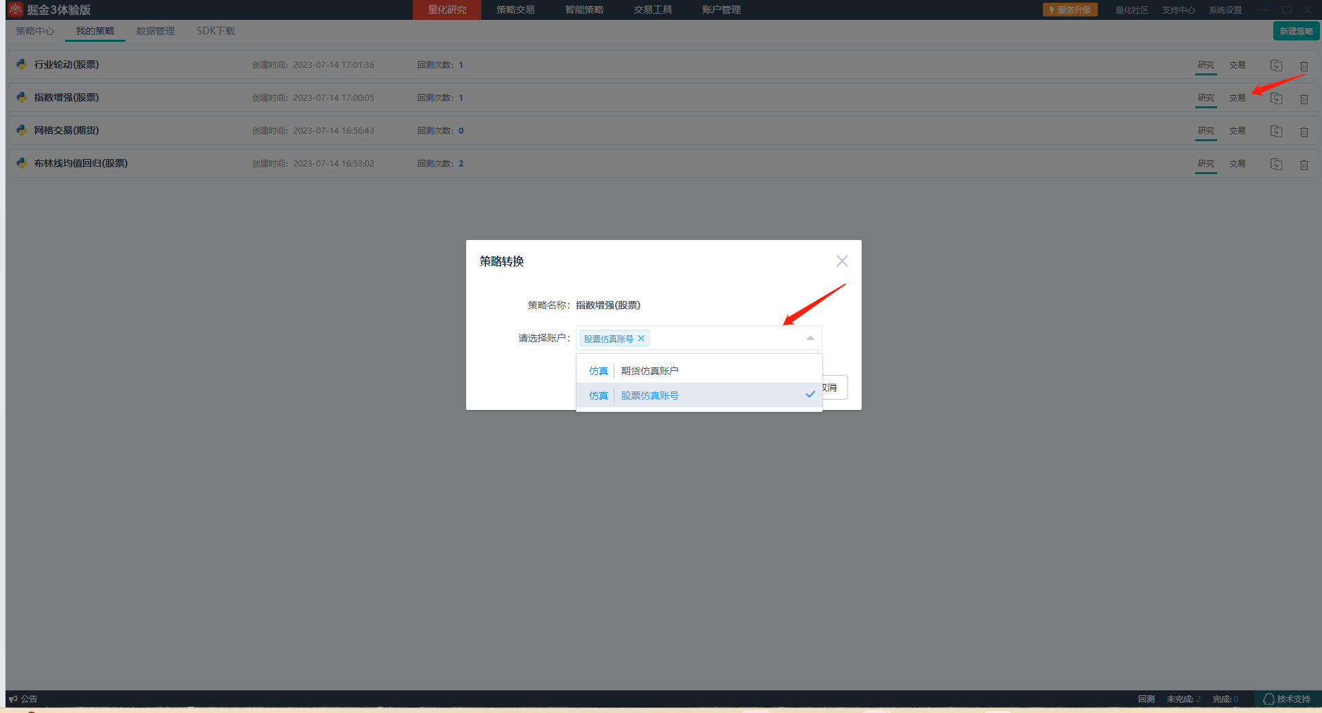 2、点击“量化研究”板块,在“我的策略”中选择要进行仿真交易的策略,然后点击该策略右侧的“交易”按钮,选择仿真账户。