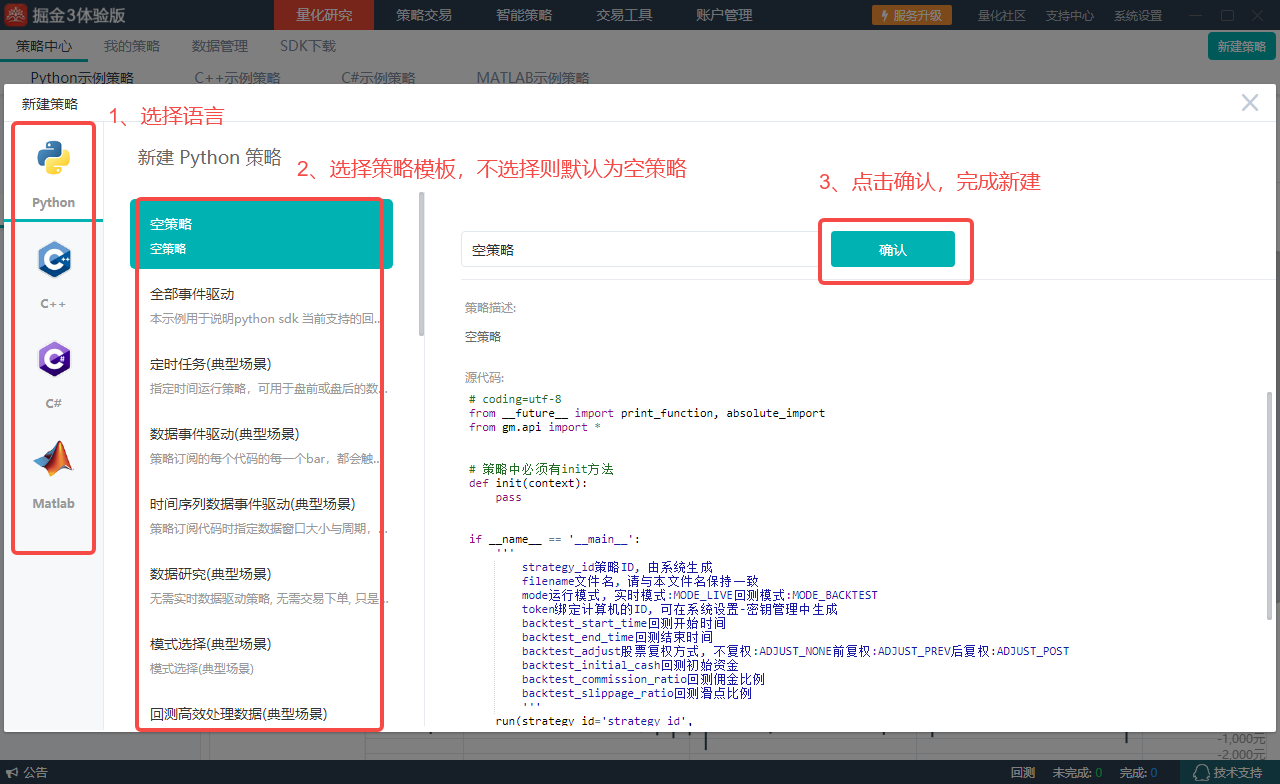 2、选择编程语言和策略模板后,点击确认按钮。如不需模板,可选择“空策略”。